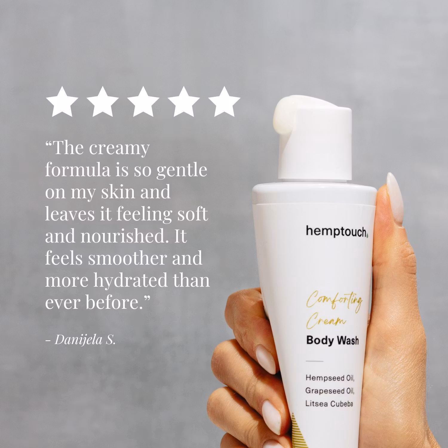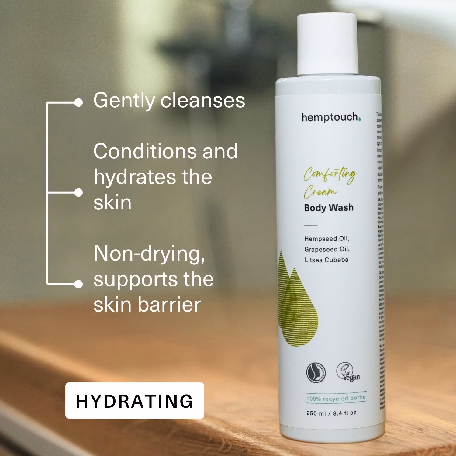 Naturlig, sulfatfri body wash med hampaolja, druvkärneolja och litsea. Rengör varsamt, återfuktar och stärker hudbarriären för mjuk, lugn hud.