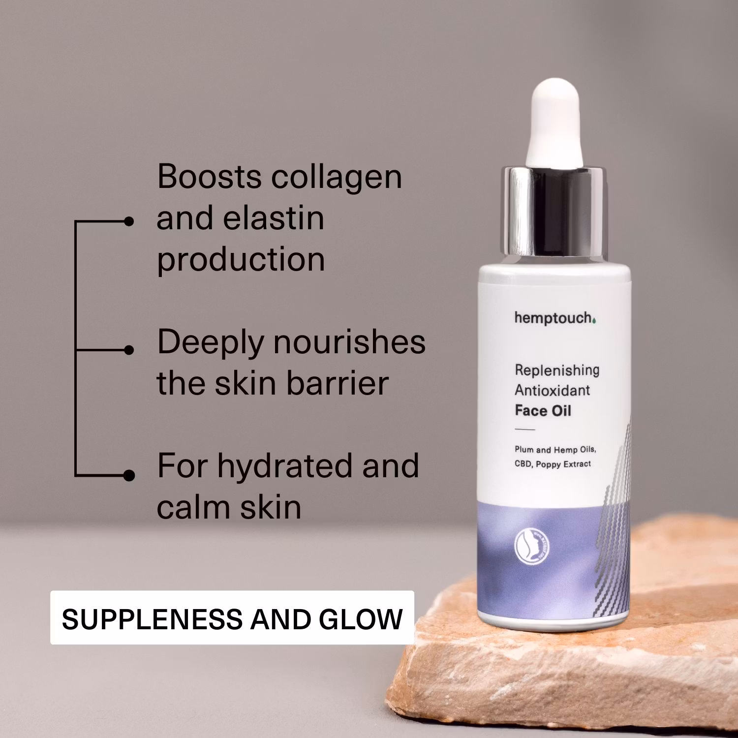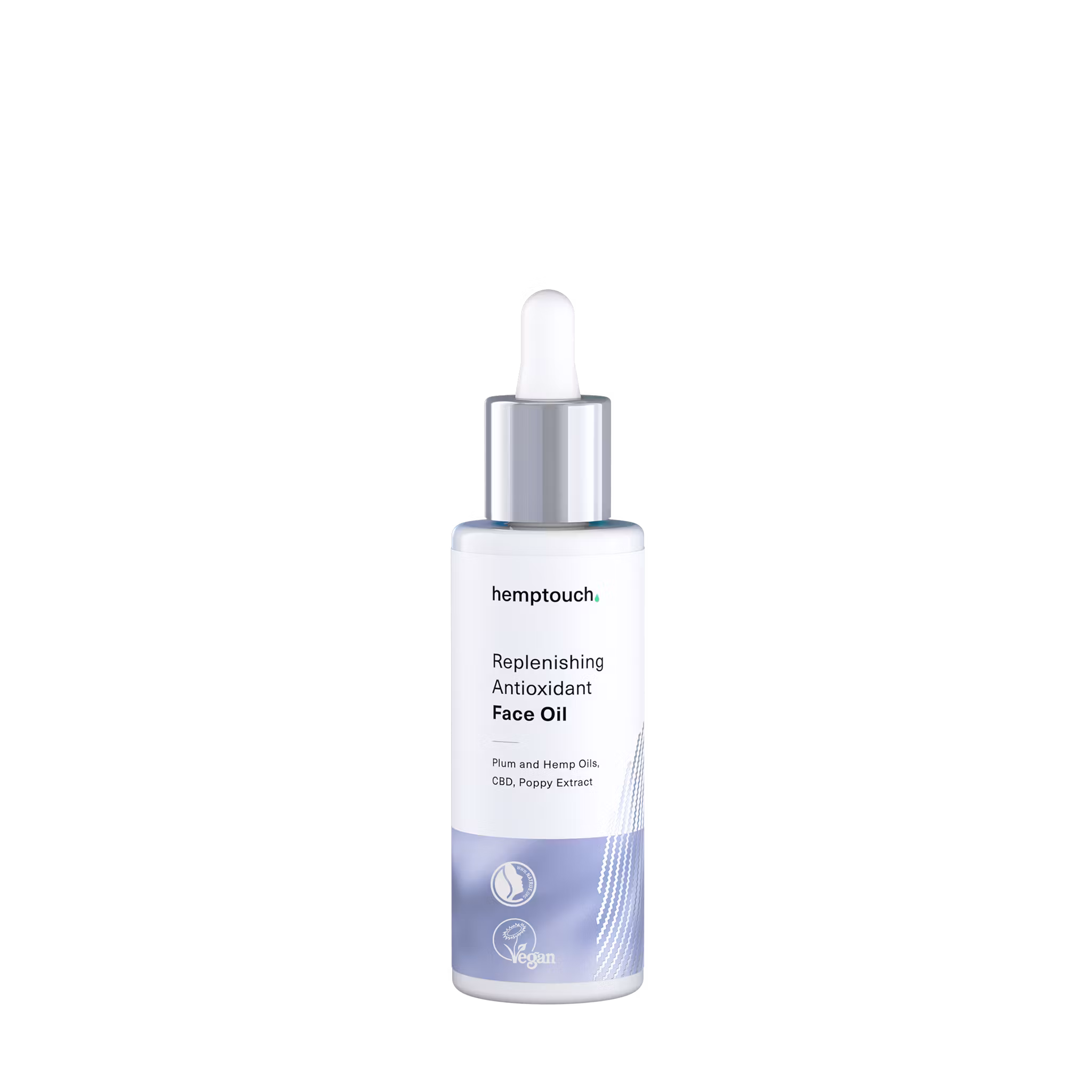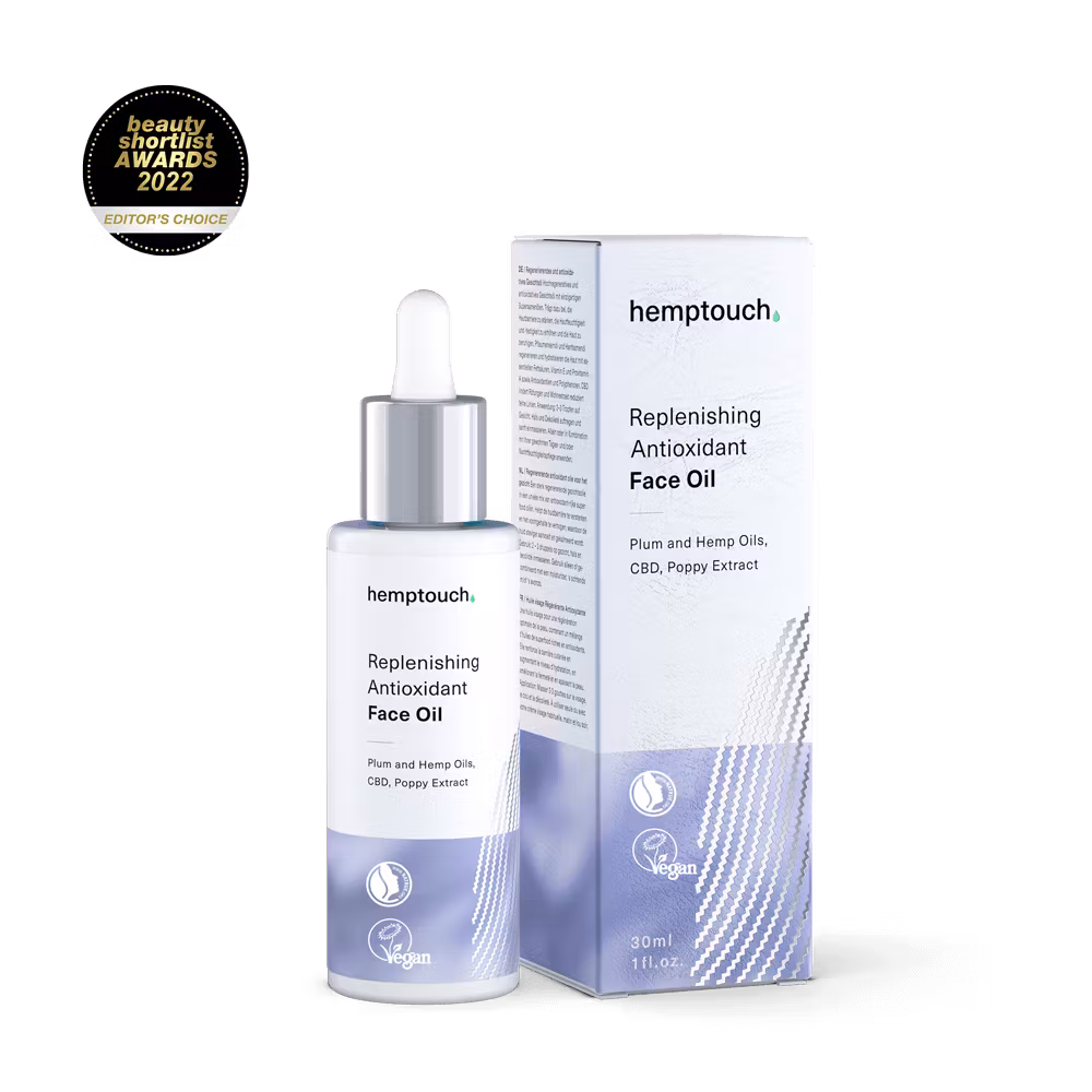 Lyxig, naturlig ansiktsolja med hampa, CBD och plommonkärnolja som stärker hudbarriären, återfuktar på djupet och ger mjuk, strålande hud.