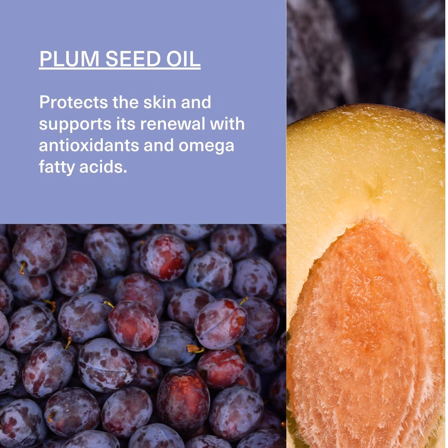 Plommonkärnolja är en utmärkt källa till närande vitaminer och antioxidanter. Rik på polyfenoler samt omega-6- och omega-9-fettsyror hjälper den till att skydda huden mot yttre påfrestningar, medan vitamin E och pro-vitamin A bidrar till långvarig återfuktning och stödjer hudens naturliga förnyelse. Tillsammans med hampfröolja ger den den perfekta balansen av omega-3, 6 och 9-fettsyror som speglar hudens naturliga lipidprofil – vilket stärker barriären och gör huden mjuk, lugn och behaglig.