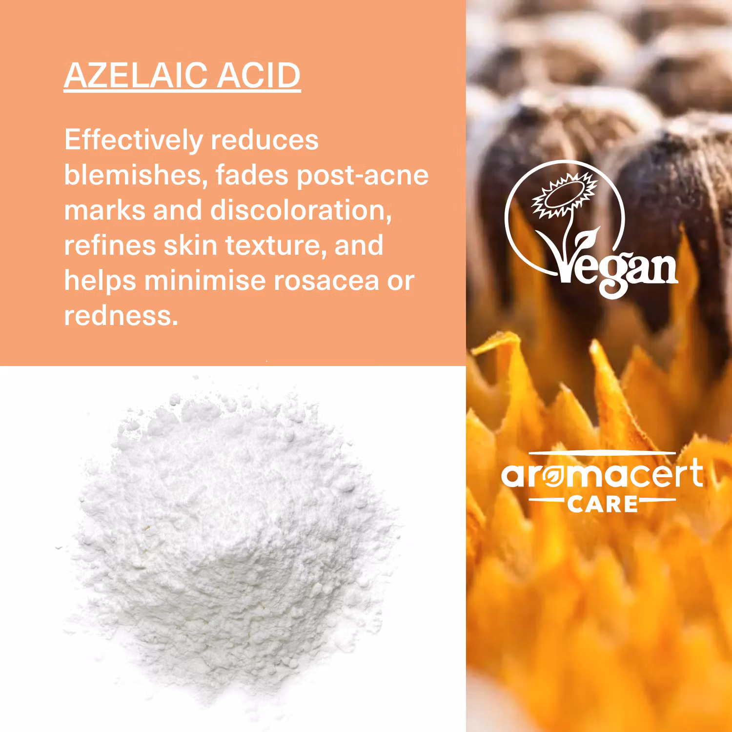 Azelainsyra tillhör gruppen dikarboxylsyror och förekommer naturligt i vete, råg, korn och i hudens eget mikrobiom. Molekylen, som naturligt finns i huden, har en enastående förmåga att påverka flera hudtillstånd som påverkar hudens utseende – såsom inflammatoriska processer, hudens åldrande och intensiteten av hyperpigmentering. Samtidigt stödjer den en stark hudbarriär och ett balanserat mikrobiom. Den ger mycket goda resultat vid tillstånd som rosacea, akne, hyperpigmentering, melasma, postinflammatoriska märken och perioral dermatit.