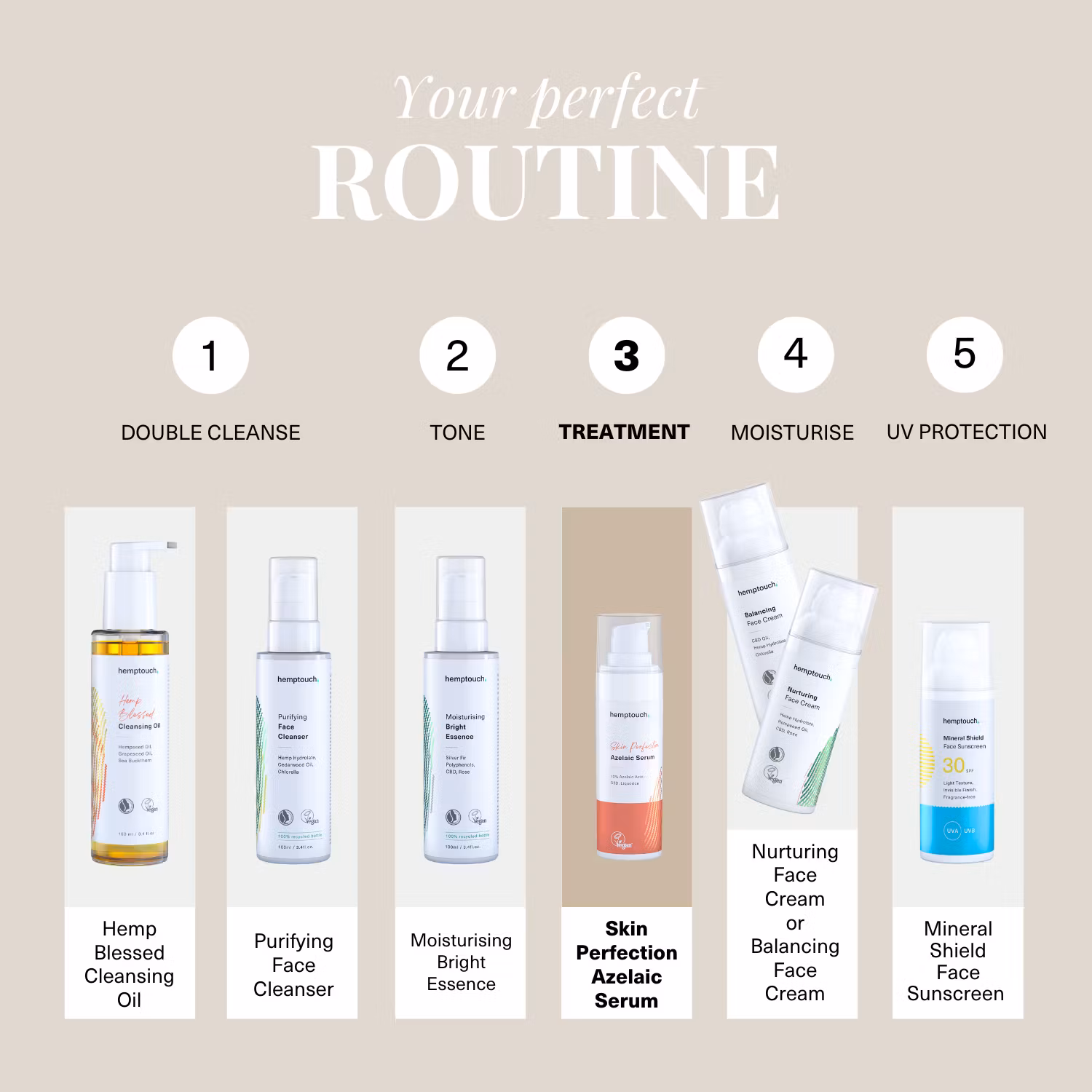 10 % azelainsyra har dokumenterat antiinflammatoriska och antibakteriella egenskaper som hjälper till att dämpa akne, minska hyperpigmentering och jämna ut hudtonen. Lakritsrot lugnar rodnad och bidrar till en jämnare hudton. CBD fungerar som antioxidant och hjälper till att skydda huden mot yttre stress samtidigt som den bevarar dess balans och komfort.