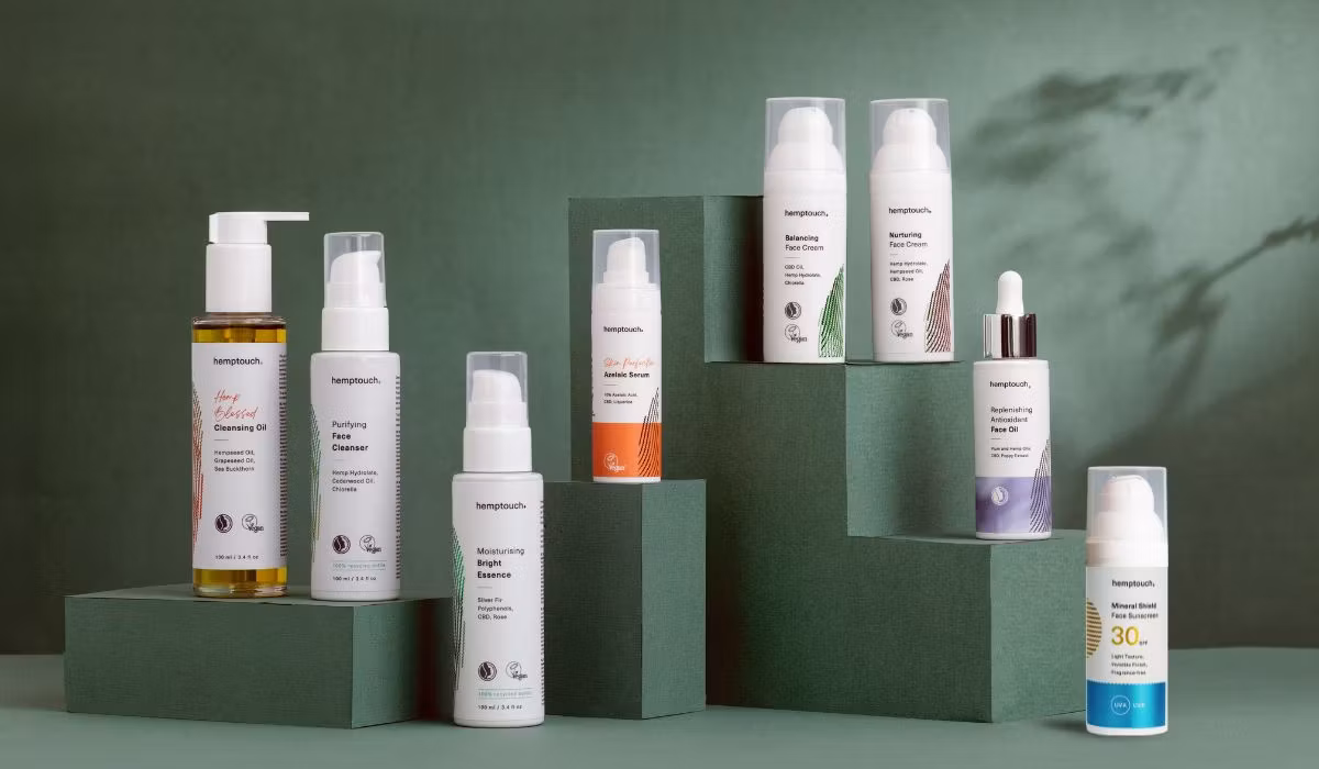 Rosa damascena flower water, Cannabis sativa water, Azelaic acid, Dicaprylyl ether, Caprylic/capric triglyceride, Coco-caprylate/caprate, Undecane, Aqua, Glyceryl stearate citrate, Glycerin, Glyceryl stearate, Tridecane, Cetearyl alcohol, Sodium salicylate, Sodium hydroxide, Sodium hyaluronate, Cannabidiol, Rosa canina seed extract, Tocopherol, Helianthus annuus seed oil, Glycyrrhiza uralensis root extract, Citrus paradisi peel oil, Pelargonium graveolens oil, Rose flower extract, Citral*, Limonene*, Linalool*, Citronellol*, Geraniol*, Eugenol*, Pinene*, Beta-caryophyllene*, Terpineol*, Geranyl acetate*, Farnesol*, Benzyl alcohol*.