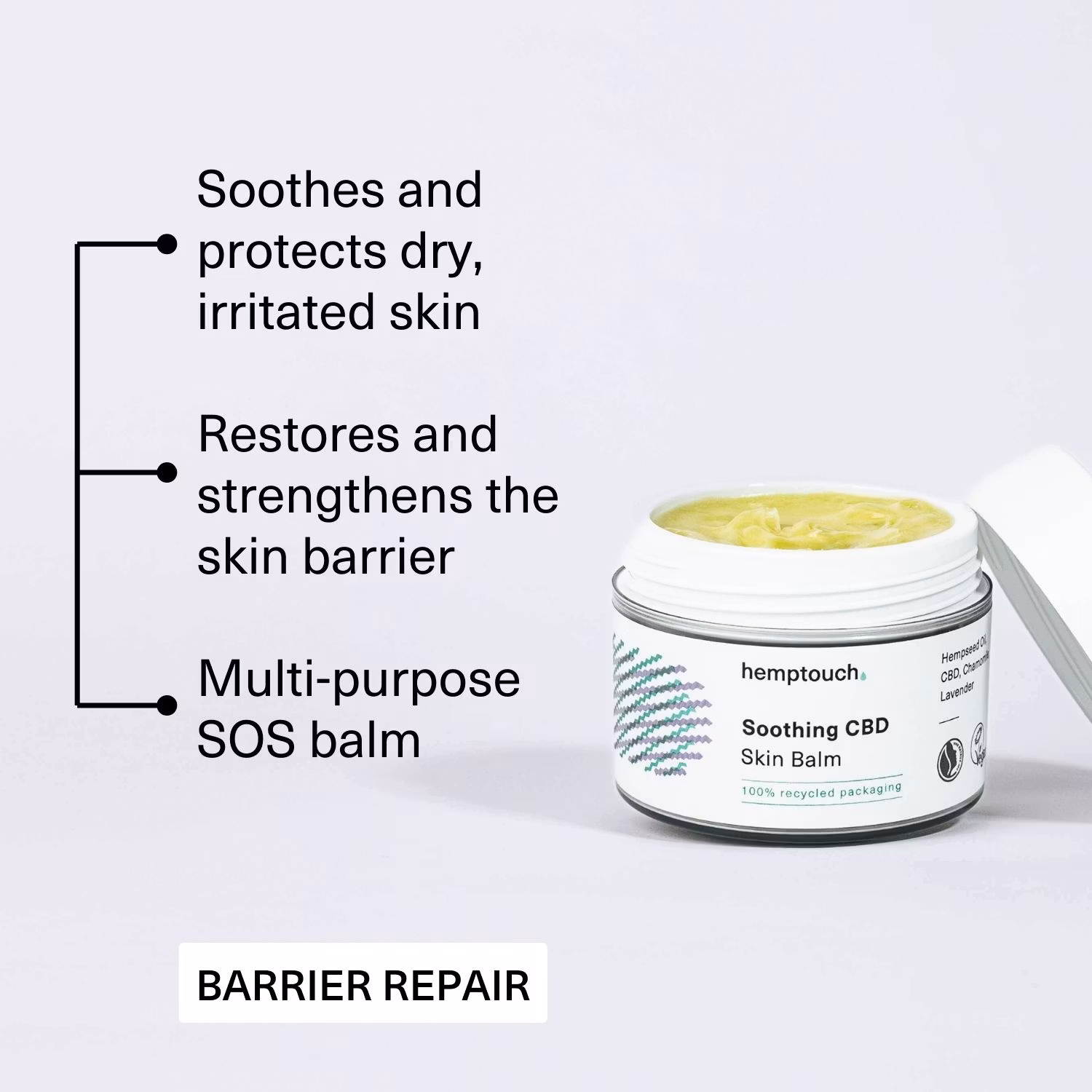 Det regenererande och hudstärkande balsamet är berikat med hampfröolja som fyller på hudens viktiga lipider och hjälper till att bevara den naturliga fuktnivån.