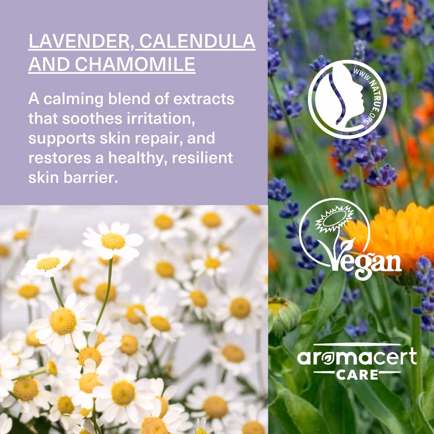 Kamomill och lavendel verkar lugnande och stödjer hudens naturliga återhämtning.
