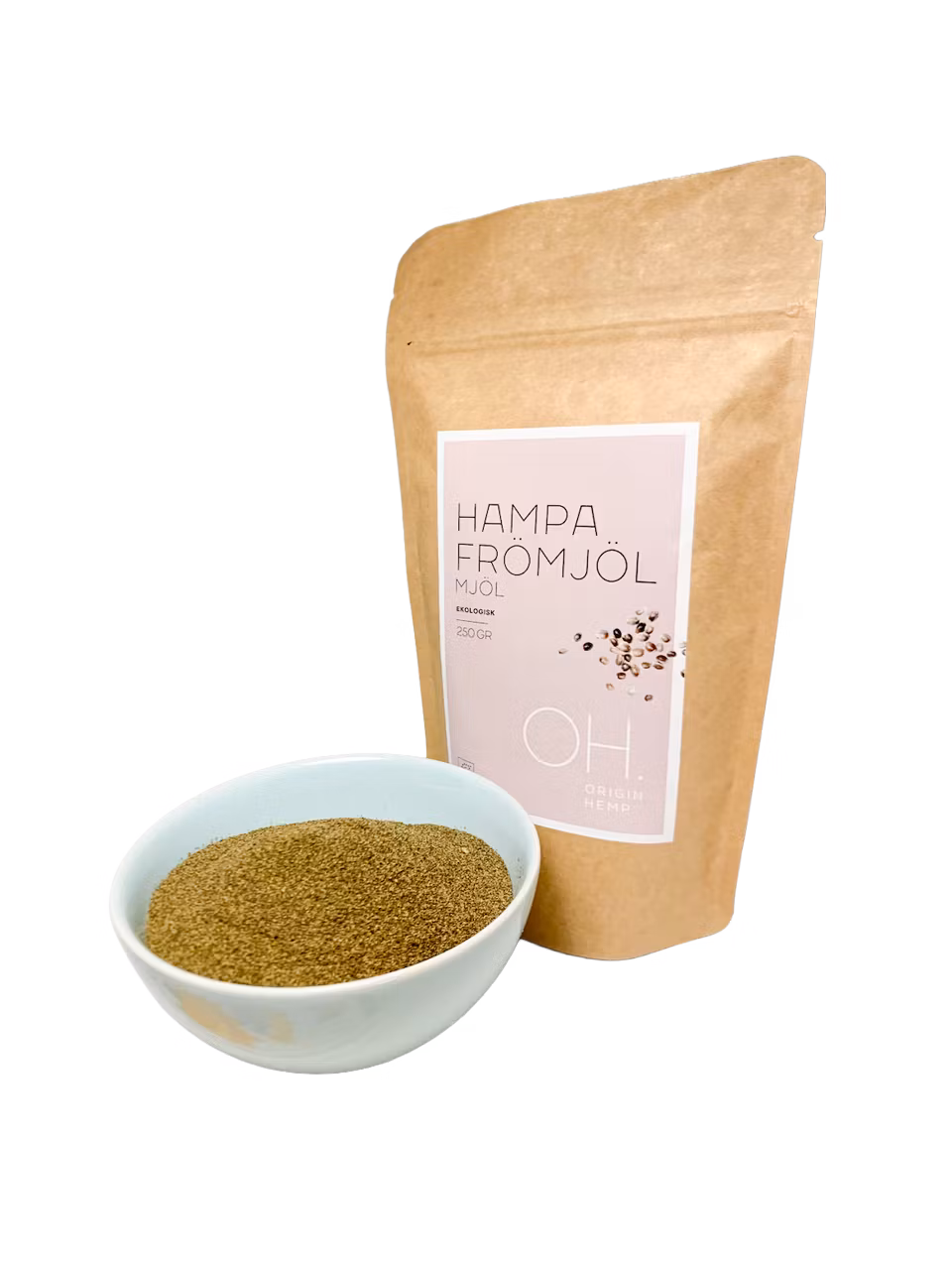 OriginHemps hampamjöl tillverkas genom att presskakan – den del av hampafröet som blir kvar efter oljepressningen – torkas och mals ner till ett fint mjöl.